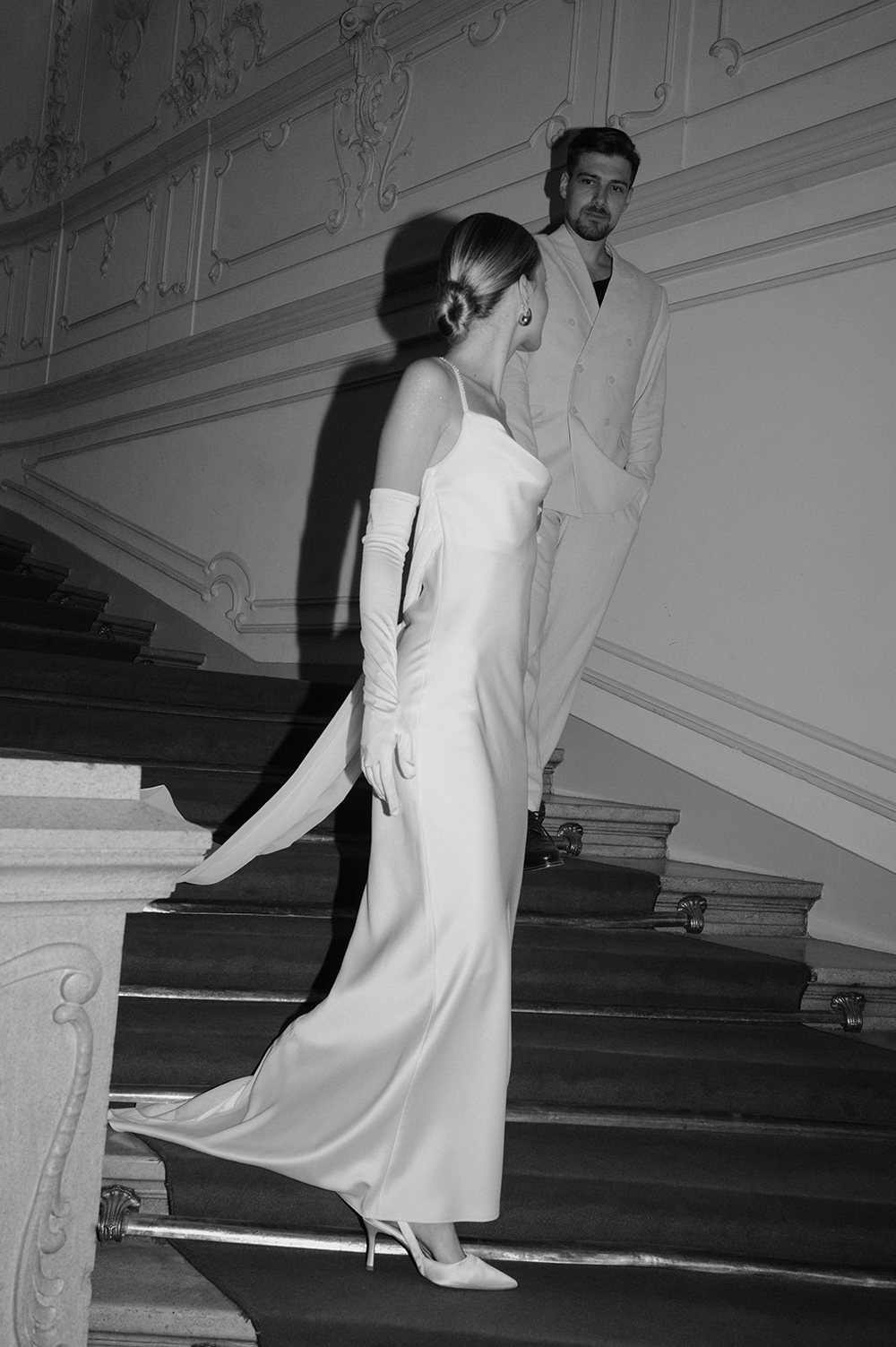 Minimalista, letisztult esküvői ruha a modern menyasszonyoknak. A JULIA ruha azoknak a menyasszonyoknak készült, akik nem terveznek hagyományos esküvőt. Letisztult, egyszerű, kényelmes menyasszonyi ruha, gyöngyházfényű szaténból elkészítve. Enyhén sellő fazonú, mini uszállyal, a minimalizmus jegyében. Nyitott hátát egy muszlin kötő díszíti. Vékony vállpántja kézi gyöngyözéstől csillog. Tedd romantikussá egy különleges fátyollal!